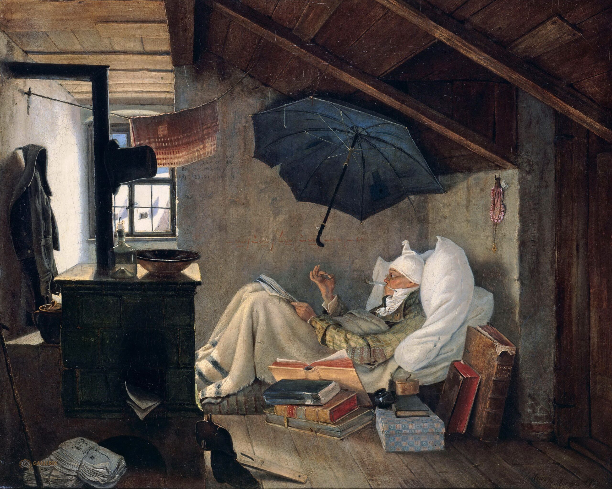 Spitzweg nos muestra con gracia la condición del artista en general. Una obra maravillosa y de la que podemos aprender mucho si consideramos un detalle en especial: cómo logra el tono humorístico. Si acaso quitáramos el paraguas, la escena ya no es graciosa, por lo que además deja de ser una sátira y ni siquiera le queda mucha fuerza realista como crítica social.