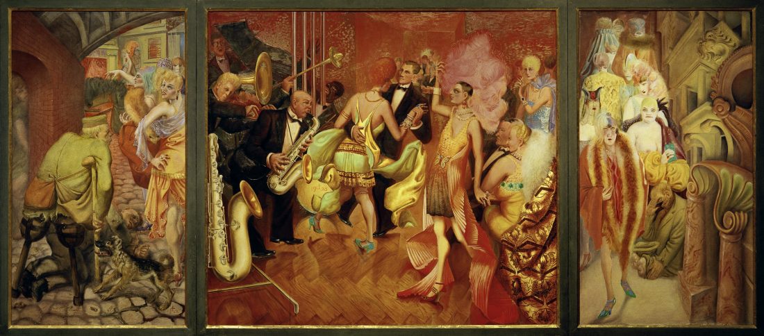 En los paneles laterales, Dix nos muestra lo que hay más allá de las paredes del salón de la fiesta: la tensión social, el hambre, los lisiados de la guerra (pobres veteranos mutilados que, apenas unos años después de la guerra, con el olvido y el desprecio son tratados ahora peor que por el enemigo) y la prostitución. En fin: una vida miserable y desesperanzada.
